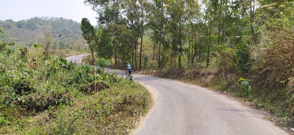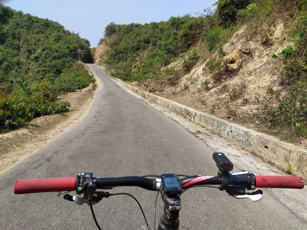 ডান পাশে খৈয়াছড়া ঝর্ণা আর বাম পাশে বোয়ালিয়া বাউশ্যা ঝর্ণার ট্রেইল, মাঝখান দিয়ে আমাদের রাস্তা। কিন্তু রাস্তাটা যে একদম সোজা পাহাড়ে উঠে গেছে! আমরাও পিছনের গিয়ার একদম এক এ নিয়ে এসে গায়ের সর্বশক্তি দিয়ে প্যাডেল মারতে লাগলাম। অনেকক্ষণ চালানোর পরেও দেখি মাত্র কয়েকশ মিটার এগিয়েছি, তার উপর আজকে চড়া রোদ! শাজ একদম ধৈর্য্যের শেষ সীমায় পৌঁছে গেল, কেন আমরা N1 এর মত রাস্তা ছেড়ে এই রাস্তা ধরে যাচ্ছি সেটাই তার মাথায় ঢুকছেনা, ও আবার N1 এ ফিরে যেতে চায়। স্পষ্ট বুঝতে পারছি শাজের কথাই যুক্তিযুক্ত, ম্যাপ অনুযায়ী যদি আসলেই ২০কিলো এইরকম রাস্তায় চালাতে হয় তাহলে আজ রাত বারোটার আগে চিটাগং যাওয়া সম্ভব হবেনা। তার উপর আমাদের কাছে পানিও পর্যাপ্ত পরিমাণে নেই। কিন্তু ততক্ষণে আমরা একদম মীরসরাই রেঞ্জের ভিতরে ঢুকে গেছি, দুই পাশে এই পাহাড়ের সারি ফেলে কিভাবে এখন N1 এ ফিরে যাই! অতঃপর কিছুক্ষণ নিজেকে বোঝানোর ব্যর্থ চেষ্টা করে শাজকে বললাম, ‘ঠিক আছে, তুমি চাইলে নিশ্চয়ই ফিরে যাব, কিন্তু আমি এই রাস্তা ধরেই এগুতে চাই’। ততক্ষণে পাহাড় ও নিশ্চয়ই তার স্বভাবমত তাবিজ-কবচ করা শুরু করে দিয়েছে, কারণ দেখলাম শাজও আর উলটো দিকে না ঘুরে খাড়া রাস্তা ধরে রওনা দিল।